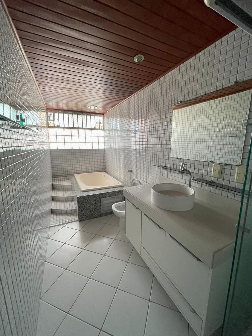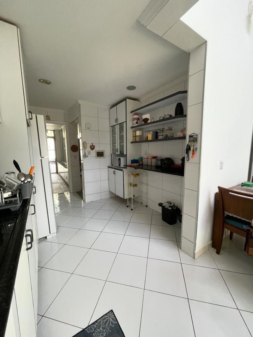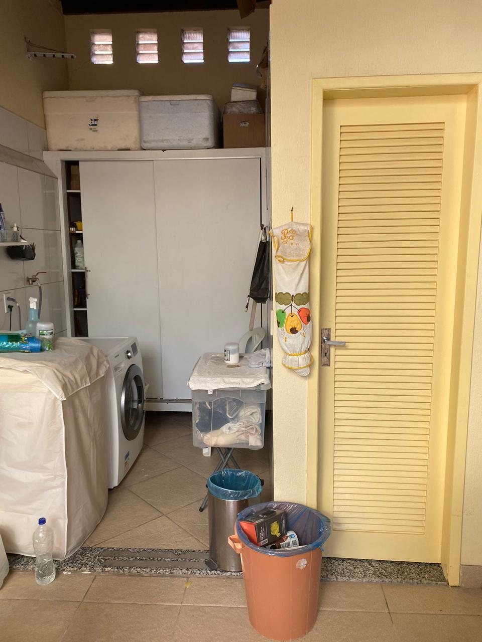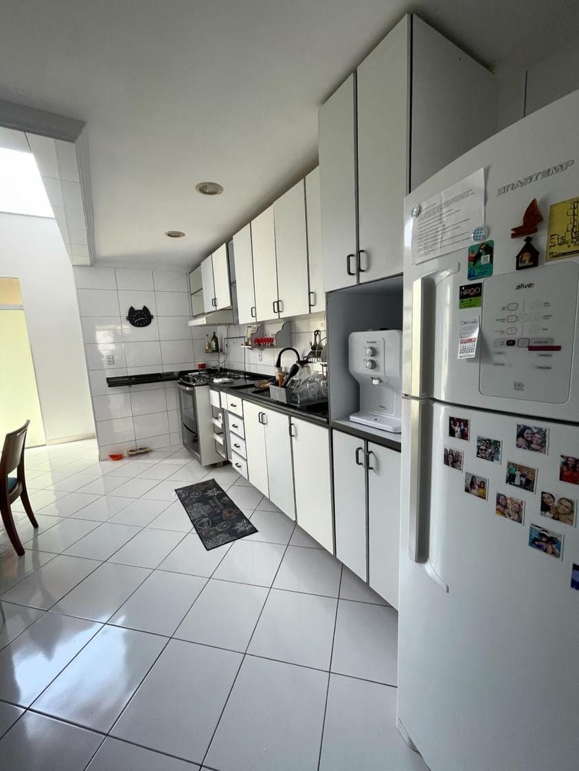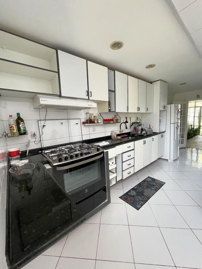 A casa conta com 4 quartos, sendo 2 suítes (uma suíte master com varanda, closet e banheira), além de 2 salas amplas, 5 banheiros, 2 cozinhas com armários planejados, 2 áreas de serviço, 2 varandas e 2 vagas cobertas de garagem.
