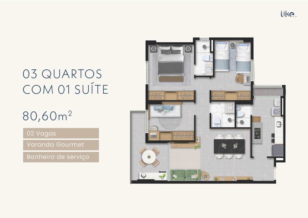 80,70 m² – 3 quartos, varanda gourmet, banheiro de serviço, 2 vagas de garagem