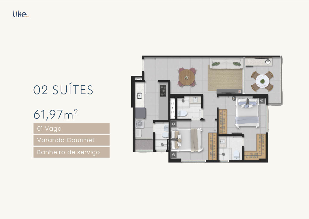 62,07 m² – 2 quartos, varanda gourmet, banheiro de serviço, 1 vaga de garagem