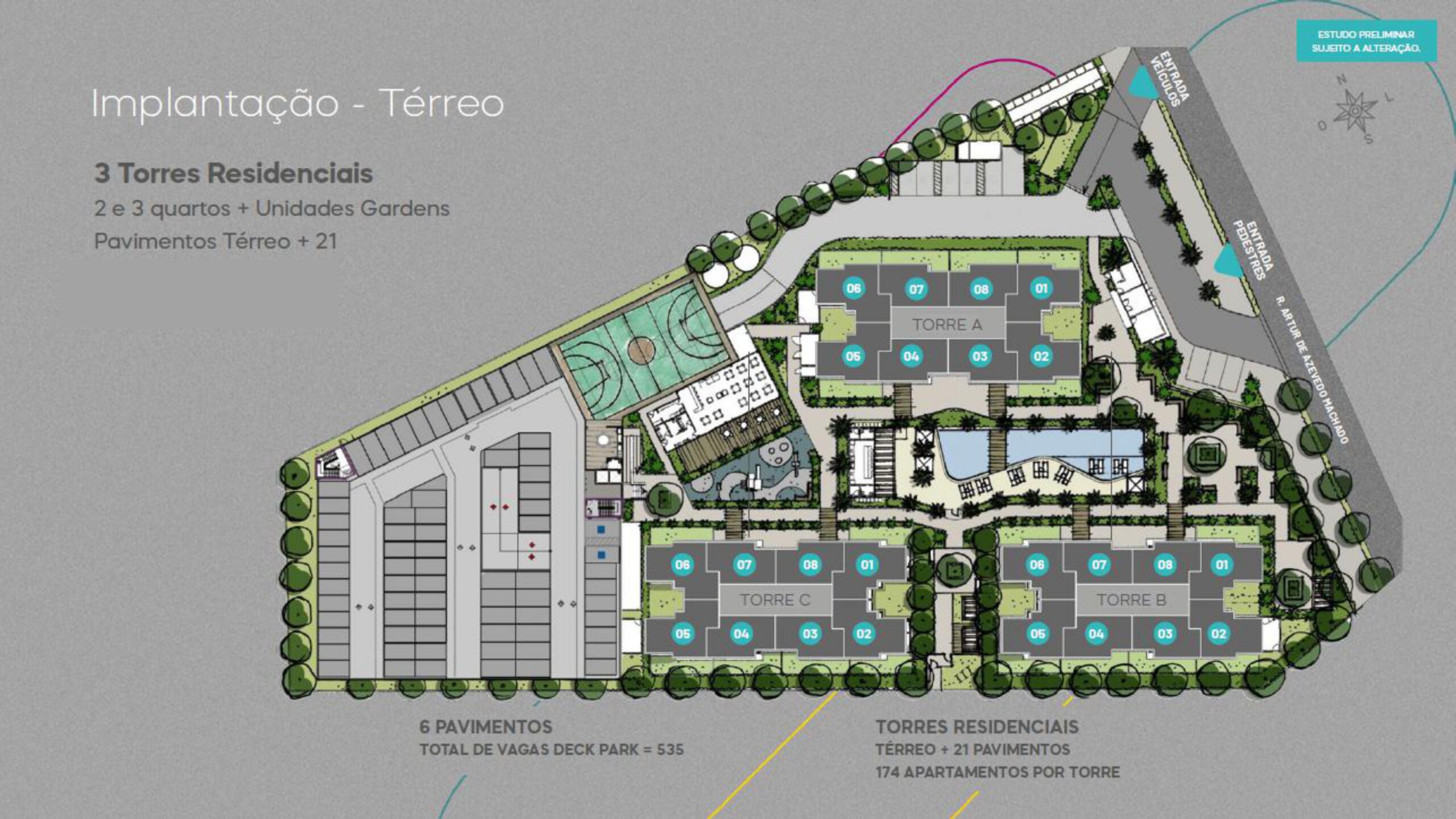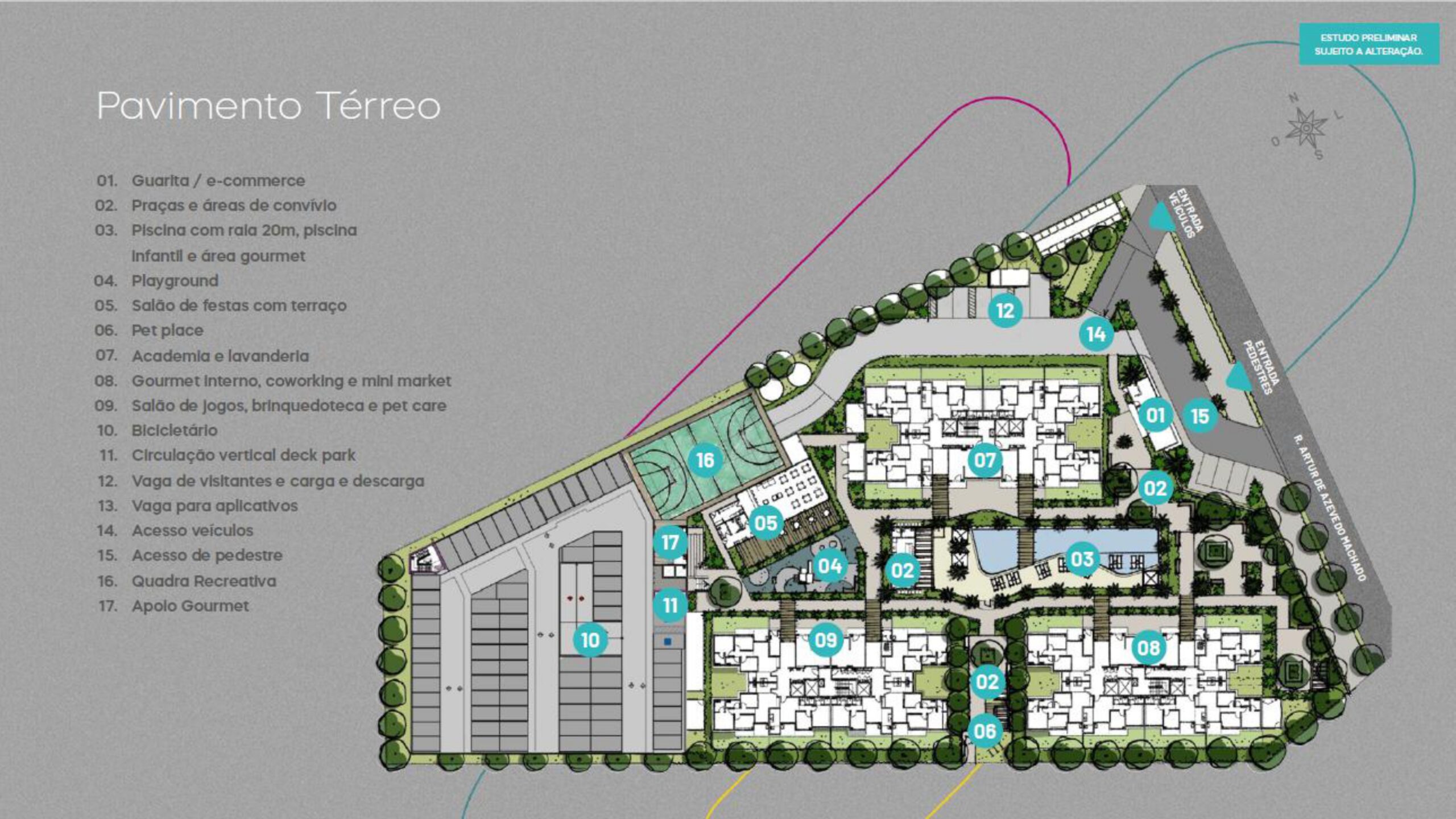 -Características: Guarita/e-commerce | Praças e áreas de convívio | Piscina com raia 20m, piscina infantil e área gourmet | Playground | Salão de festas com terraço | Pet place | Academia e lavanderia | Gourmet interno, coworking e mini market | Salão de jogos, brinquedoteca e pet care | Bicicletário | Circulação vertical deck park | Vaga de visitantes e carga e descarga | Vaga para aplicativos | Acesso de veículos | Acesso de pedestres | Quadra recreativa | Apolo gourmet